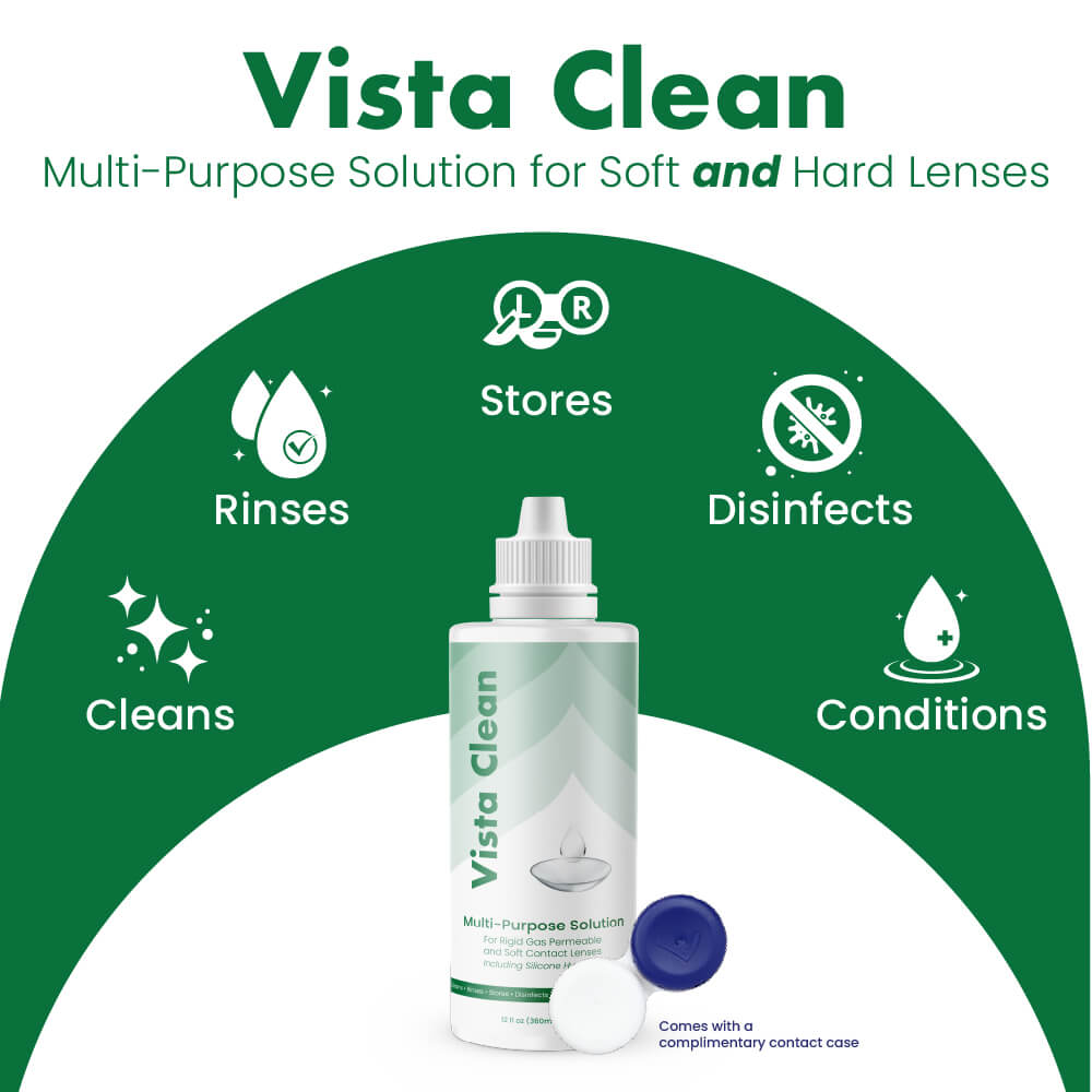 Included with the solution is a contact lens case, offering a clean, secure place to store your lenses when not in use. This added convenience makes Vista Clean a practical, travel-ready option for both daily wearers and occasional users.